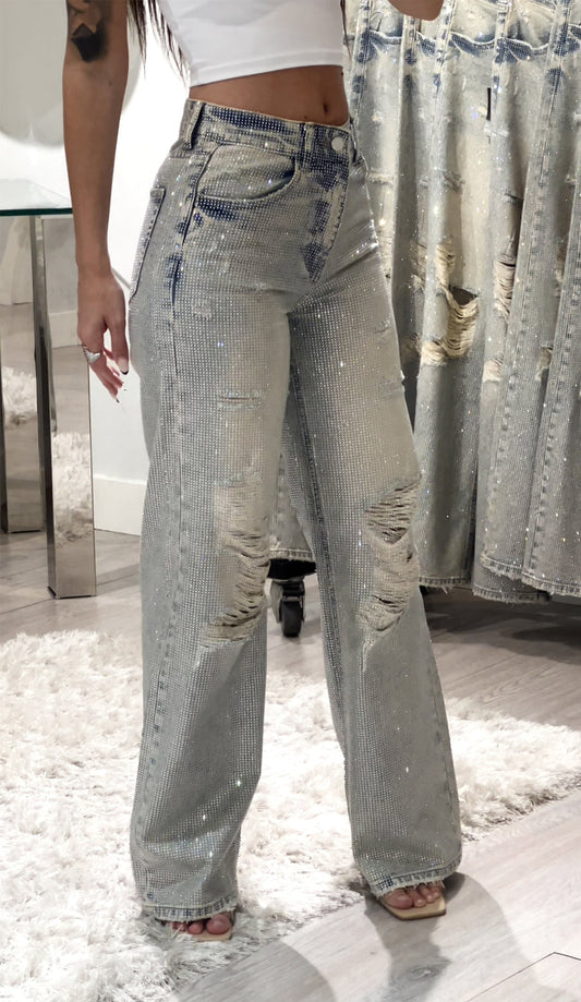 Full Diamanté Blue Wide Leg Sparkle Covered Jeans