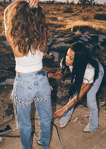 Ladies Denim Blue Lace-up Straight Trend Denim Tights