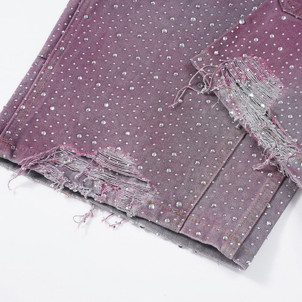 Gradient faded denim provides the canvas for these calf-length shorts, where premium rhinestones brilliantly sparkle and dance in the light. The distressed details and multiple pockets balance practicality with artistic expression, creating a piece that sits comfortably between streetwear and statement.