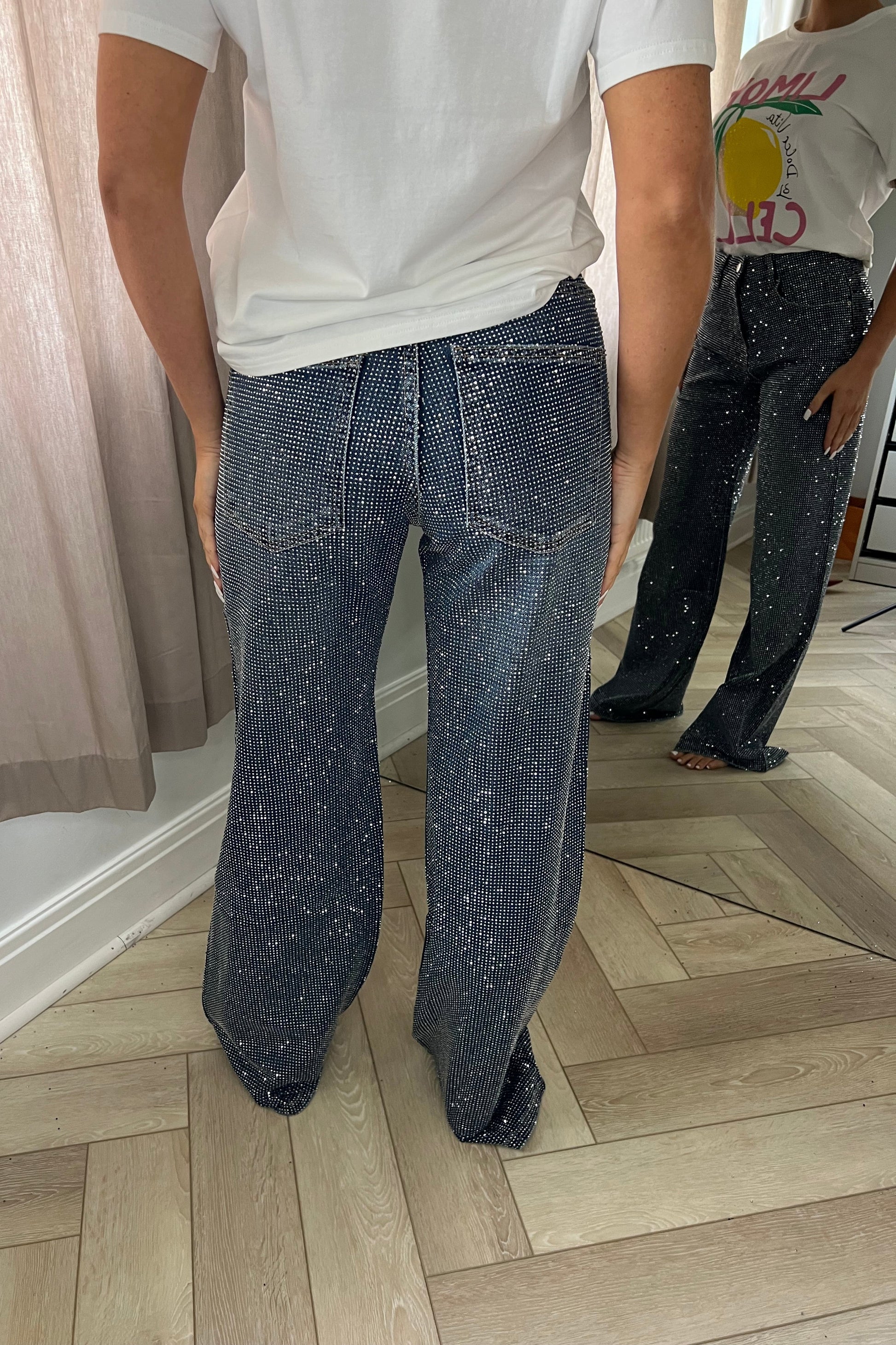 Full Diamanté Blue Wide Leg Sparkle Covered Jeans