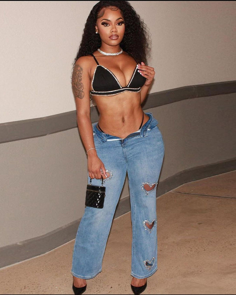 Women Straight Heart Diamond Hollow Out Pockets Vintage Denim